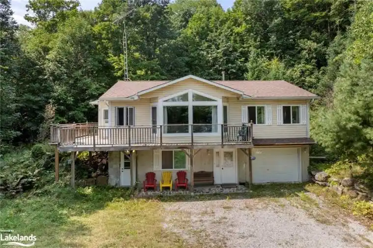 Nestled within 3.28 acres of natural splendor, this custom-built Royal Home was designed for family living and has had the same owners from construction onwards. A lovely peaceful property, where wildlife frolics amidst beautiful Haliburton forestry. A sanctuary abundant with deer, bunnies, chipmunks, and birdsong creates an idyllic setting for this charming retreat. The large front yard beckons children and pets to play while the additional acreage is ideal for nature hikes. Step inside this country home to discover a fantastic main floor plan that effortlessly flows from room to room. The light filled windows offer scenic views of Maple Lake. Two cozy bedrooms and two baths on the main level provide comfort and convenience, complemented by an open-concept kitchen, dining area, and living room designed for modern living. Descend to the lower level where a welcoming family room awaits alongside a laundry/utility room ready for your needs. A third bathroom is roughed in for future expansion while direct access to the garage allows for easy coming and goings. The lower level opens onto a walkout patio that leads you into nature’s embrace. Conveniently located on a year-round municipal road close to local amenities such as golf courses, downhill and cross-country skiing, snowmobile trails, restaurants, and abundant shopping options – everything you need is within a 20-minute radius. The sellers have enjoyed the waterfront activities on Maple Lake for 20+ years hard sand entry with great swimming (they do not own the shoreline). Maple Lake is a 3-Lake chain with Pine & Green Lake renowned for lake trout, bass & pickerel fishing. Updated shingles 2021. Includes a back up Solar System (new batteries required). Propane Furnace, Drilled Well, Septic and RV parking building complete the package!