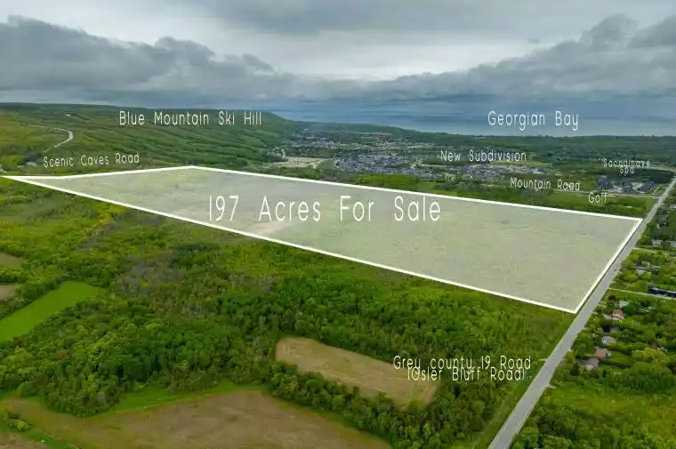 Rare opportunity for investors & developers alike! 197 Acres +/- of four seasons adventures at the base of blue mountain, AAA+ Location! This expansive parcel of land is situated within the towns Future Secondary Plan (FSA). Fronting on both Scenic caves road, and Grey county 19 road (Osler Bluff). This parcel of land has the Potential to develop into a subdivision once the town infrastructure permits, or a great land-bank opportunity for the future. Currently it is permitted to: build a single detached luxurious dwelling or hobby farm. With breath-taking views of Blue Mountain and a rich history as a apple orchard, this property is sure to be a valuable asset for anyone looking to invest in this rapidly developing area. Perfectly situated on the other side of the street from Blue Mountain Ski Resort. Official Plan: “Future Secondary Plan Areas” (Fsa); Town Zoning : “Deferred Development” MPAC :”Residential Development Land” Both the Buyer And Buyers Agent are To Perform their Own Due Diligence To Satisfy Themselves With The Current Use, and Future Potential Of This Property. Here is your opportunity, Discover the great Canadian Outdoors and get ready for your chance, to be a part of Blue Mountain’s future.