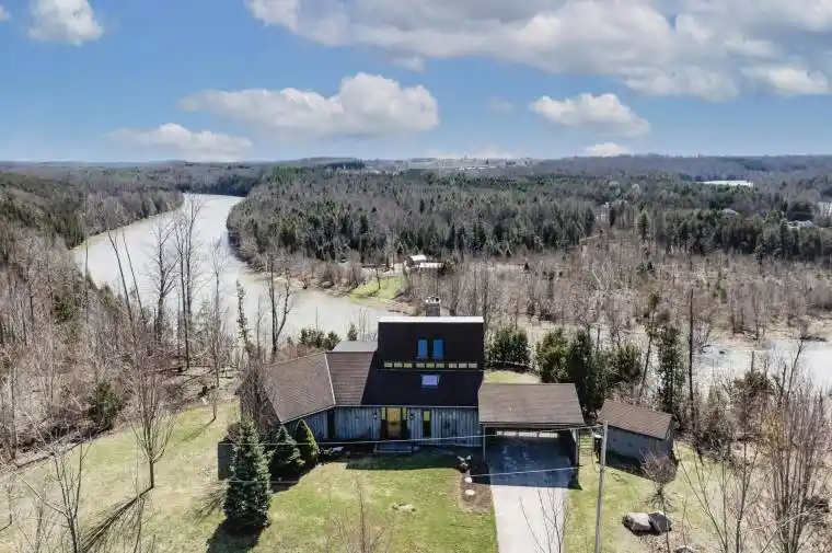 It started in 1977 with a hand made model, an eye for northern light exposure into a studio, and a desire for a view of the Maitland River and it’s valley. It then became a unique, 6 bedroom, 4 bathroom architecturally interesting home for this owner to enjoy the River and all it has to offer. Perched atop the valley, this home was built to inspire the owners artistic creativity, and provide a tranquil setting to enjoy nature. With over 1000 feet of river frontage, and a park like setting up where the house sits, the access to the Maitland Trail, which winds through the property, is a short walk away. Some other unique features of this home are it’s glass solarium (with most windows replaced in 2012) a living room with a propane fireplace (2020) and spiral staircase leading up to the art studio/family room with it’s unique propane stove (2020), and north facing windows to capture natural light. The primary bedroom has replaced windows (2021) and a stunning view of the river and valley. This is an interesting house with a rich history!
