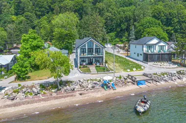 Imagine waking each morning to gentle waves lapping the shore, sunlight dancing across endless water. This is life at Turkey Point, where Lake Erie’s northern shore becomes your personal paradise. Nestled in charming Turkey Point, Ontario, this extraordinary property offers the ultimate retreat from everyday life. Here, cozy cottages dot the shoreline, local eateries serve fresh catches, and life moves to the gentle cadence of boats returning to harbor. This peaceful enclave has long been a magnet for those seeking authentic waterfront living, and now it can be yours. Built in 2022 on a tranquil dead-end cul-de-sac, this stunning lake house was designed with one singular vision: to celebrate the magnificent water views that stretch endlessly before you. Every angle, every room, every carefully placed window serves to connect you with the ever-changing beauty of Lake Erie. Step through the front door and be embraced by over 3,800 square feet of thoughtfully designed living space. The modern architecture features soaring windows that frame the water like living artwork, transforming your daily routine into breathtaking moments. The two-story design centers around expansive living areas that dissolve boundaries between indoor and outdoor living. Two great rooms provide multiple gathering spaces, each offering its own unique lake perspective. Whether hosting intimate dinners or grand celebrations, guests will be captivated by the ever-present backdrop of shimmering water. The dual kitchen concept ensures entertaining flows seamlessly. Imagine preparing meals while watching sailboats drift by, or enjoying morning coffee as sunrise paints the water in brilliant hues. An elevator provides effortless access to both levels. Five bedrooms offer peaceful retreats. Three bathrooms provide comfort, while the three-car garage includes upper suite potential. From this vantage point, Lake Erie becomes your playground. Nothing beats life on the water! Luxury Certified.
