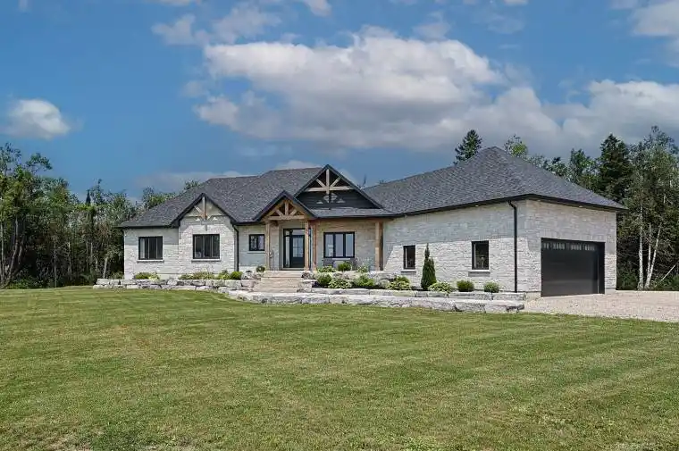 Tucked away on a 3.3-acre lot on a paved road just minutes from town, this beautifully crafted home offers a seamless blend of modern luxury and natural surroundings. From the moment you arrive, the professionally landscaped grounds, stone walkways, timber beams, and armor stone set the tone for what’s inside. The main living space is open and inviting, with vaulted ceilings, and a striking floor-to-ceiling stone fireplace that is centered as focal point. The sunken living room creates a cozy atmosphere, while the kitchen features a large island, quartz countertops, and a walkout to the raised deck ideal for barbequing & entertaining. The primary suite is a true escape, complete with two walk-in closets, a spa-like ensuite with a soaker tub overlooking the woods, and its own private deck. A large mudroom connects the home to an oversized two-car garage, making day-to-day life feel effortless. Downstairs, the walkout basement is full of potential including the opportunity to become an in-law suite. This home delivers on both style and substance with quality finishes throughout – a rare combination of privacy, convenience, and high-end craftsmanship. 10 minutes to Dundalk, 20 min to Shelburne, 30 min to Collingwood, 40 min to Orangeville, 1 hr 45 min to Toronto.