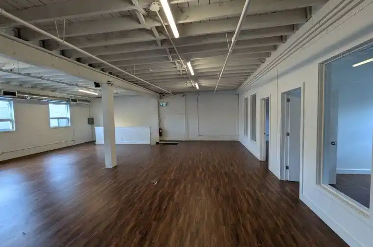 Super second floor open concept office studio with a private entrance. 10 foot ceilings & 7 new windows result in a very bright space with tons of natural light. Great layout with 2 private offices, white walls & stressed oak-like floor. New lighting, 3-piece bathroom with shower, kitchenette, & Hvac With Ac. Excellent Studio Space Ideal For Marketing & Tech Companies. Professional Ownership & Management. Individual Control Of Heating & Cooling. Gas & Hydro Extra. See Floor Plan.