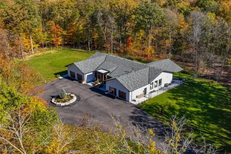 Welcome to The Forest Home! A breathtaking custom estate nestled on 6.39 acres of pristine, wooded landscape, offering the ultimate in privacy, serenity, and refined living. Designed as a forever home and built to exacting standards, this exceptional bungalow is a masterclass in modern elegance and timeless design. From the moment you arrive, the homes architectural symmetry impresseswith two double garages flanking the stately entrance for a dramatic and balanced curb appeal. Inside, approximately 3,250 sq. ft. of thoughtfully curated main floor living unfolds in an airy, open-concept layout. Inspired by Scandinavian simplicity and elevated farmhouse style, every space feels grounded in nature yet luxuriously appointed. Impeccable finishes and high-end upgrades are found throughouttoo numerous to list here, but detailed in the attached brochure. Every detail has been carefully considered: from the gourmet kitchen, walk in pantry, coffee bar, every bathroom having a different theme with imported tiles and the rustic wood stove that boasts the most amazing roaring fires! Outdoor living is equally spectacular. Enjoy alfresco dining on the covered patio, unwind in the outdoor lounge, or soak in the hot tub under the starsan entertainers dream and a private retreat in one. The expansive walk-out basement with separate entrance offers limitless potential for an in-law suite, studio, or bespoke entertaining space. The long driveway accommodates guests with ease, while the brand-new 40 ft well and septic system provide long-term peace of mind. Siding onto the 40 Mile Creek, this estate feels worlds awayyet is just 6 minutes from charming downtown Grimsby and 30 minutes from the renowned wineries, boutiques, and fine dining of Niagara-on-the-Lake and Niagara Falls. With easy access to Hamilton and Burlington, this location perfectly balances seclusion and convenience.