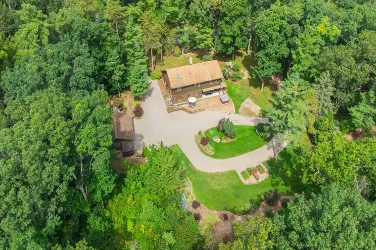 Seize this opportunity to own a piece of history in beautiful Port Franks! This picturesque log cabin is nestled on a mature treed lot and features all the conveniences of modern day living. The generous main floor boasts a cozy dining/sitting room with exposed beams, hardwood flooring and gas fireplace; double height family room with log interior walls, vaulted ceilings, sky lights, grand wooden open riser staircase, and gas fireplace; eat in kitchen with updated appliances (2019) and island with breakfast bar; updated bathroom and large foyer. The upper level boasts full views of the family room with updated main bathroom including tiled shower with glass enclosure, double sinks and stand alone soaker tub and 3 generous bedrooms including primary with vaulted ceilings, double closets and sky light. The entire home is surrounded by wrap around porches and decks with stunning landscaping and hot tub all with privacy from the mature trees. The expansive treed lot spans 198 ft front by 247ft depth. Large triple car detached garage is perfect for parking or hobbiest. Outdoor features include generous driveway with room for RV/boat parking, fire pit, irrigation system (2020), and 2 sand points which provide water for the lawn and gardens. Luxury vinyl flooring (2022), painted (2022), electrical for hot tub, and electrical for generator. Wonderful location being walking distance to 3 marinas, community centre, playground, trails and library and in close proximity to private Port Franks beach, golf coarse and restaurants.