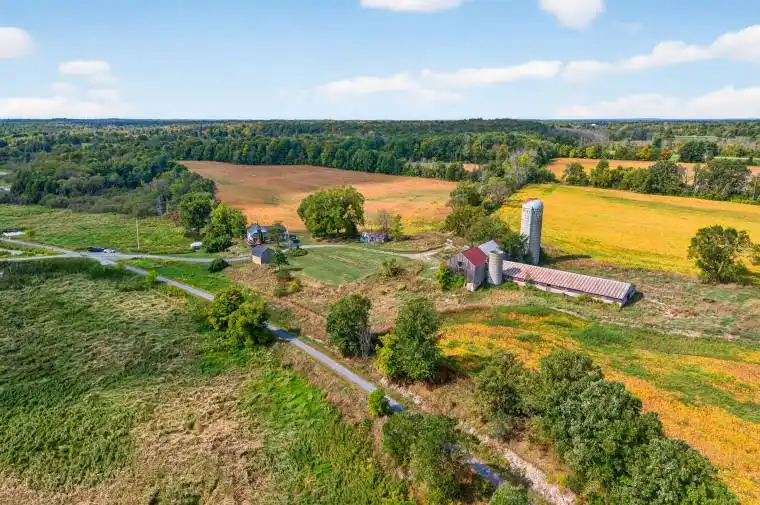 For Sale for the First Time 180 Acre Farm on Graham Road, Harrowsmith. Welcome to 4121 Graham Road, offered for sale for the very first time. This remarkable 180-acre farm is ideally located less than 20 minutes to Highway 401, with great elementary schools nearby and a short bus ride to Sydenham High School. The property boasts approximately 140 acres of workable land, currently planted in a rotation of soybeans, corn, and winter wheat. It is bordered by the K&P Trail on the east and the Cataraqui Trail on the south, making it not only a productive farm but also a truly scenic property with excellent access to recreational trails. The charming3-bedroom, 1-bath farmhouse has been lovingly maintained and features a stunningly updated kitchen with a huge island, quartz countertops, and newer appliances. A bright dining/breakfast nook, separate living room, and a cozy sitting room with patio doors to the deck create warm and inviting spaces, complemented by plenty of windows to showcase sweeping views of the farm. An attached garage adds convenience. The farm infrastructure includes the original large barn, circa World War 2, a stall barn built in the 1990’s (formerly used for dairy cattle), and several additional outbuildings, garages, and barn structures – ideal for a variety of agricultural or hobby farm uses. Updates to the home include a newer propane furnace and central air conditioning. This is a rare opportunity to acquire a productive farm with a beautiful home, extensive acreage, and all the buildings you need, in a location that combines rural living with easy access to Kingston, Sydenham, and surrounding communities.