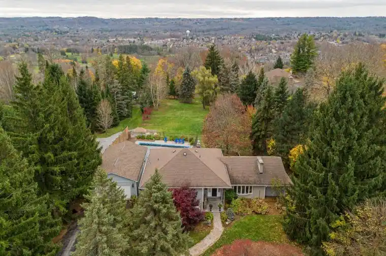 Welcome to this charming 4-level side split, originally crafted for the Grafton family in 1954. Situated on a serene 1.09-acre lot, this property boasts privacy and beauty with mature trees, a long driveway, and ample front yard space accommodating parking for 10+ vehicles, including a 20×40 garage with a lift. Perfectly located, its just 3 minutes from Dundas Valley Golf & Curling Club, 5 minutes to quaint downtown Dundas, and close to scenic trails, waterfalls, and major routes. Inside, find a bright, welcoming ambiance with hardwood throughout. The eat-in kitchen leads to a dining room with elegant coffered ceilings. The Great Room on the main level is a showstopper, featuring floor-to-ceiling windows, a wood burning fireplace, one of 5 fireplaces in the home, and an adjoining family room ideal for gatherings. Upstairs, enjoy a private primary sanctuary with views of the escarpment with a 4-piece ensuite, alongside an additional 3-piece bath with a glass shower. The lower level offers a partially finished walkup with a billiard room, which could be used as a fourth bedroom, patio access, storage, utility room, and a rough-in for a washroom. Outdoors, a private backyard oasis awaits, complete with a hot tub, a recently painted (2024) in-ground pool, and expansive views of the escarpment and golf course. New furnace installed in 2022. Don’t miss this exceptional Greensville home!