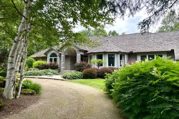 Welcome to this breathtaking countryside estate, a true gem set on 28 acres of picturesque land. This stunning property boasts mature trees, meticulously designed perennial gardens, and views of rolling hills. Offering 4,963 square feet of above-grade living space, plus a fully finished walkout basement, this luxurious home is designed for both entertaining and everyday comfort. Step inside to find 9 spacious bedrooms and 7 bathrooms, ensuring ample space for family and guests. The primary suite is a true retreat, complete with its own private balcony, a sunlit sitting room with panoramic windows, spacious walk-in closet, and a 5-piece ensuite. The main level showcases multiple walkouts to an expansive deck, where you will find a beautifully landscaped inground pool, surrounded by stone and lush gardens. Enjoy the serene surroundings from the charming gazebo, an ideal spot for relaxation. At the heart of the home, the large eat-in kitchen is a chefs dream, complete with a central island and an open-concept layout ideal for both everyday dining and entertaining. Additionally, the home includes a separate entrance to the second storey, which could serve as a nanny or in-law suite, providing added privacy and flexibility for extended family and guests. This estate is as practical as it is beautiful, featuring a triple-car garage, a cedar shingle roof, and an energy-efficient geothermal heating and cooling system. A carriage barn on the property adds character and offers additional storage or potential for various uses. Offering the perfect blend of luxury, comfort, and natural beauty, this extraordinary estate invites you to embrace the tranquility of country living. Do not miss your opportunity to make this exceptional home your own!