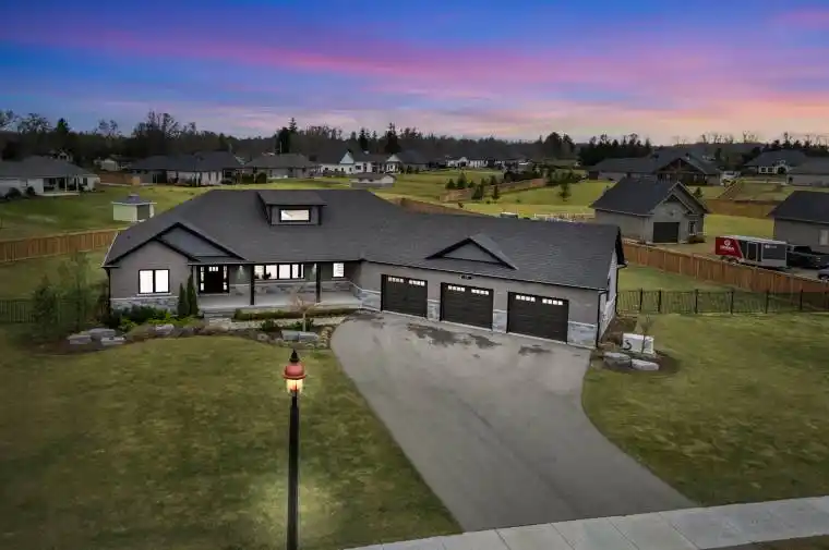 Set on nearly a full acre in a peaceful, upscale neighborhood, this stunning all-brick bungalow offers the perfect blend of luxury, comfort, and space. From the moment you arrive, the triple-car garage and oversized driveway set the tone for the elegance that continues inside. Step through the front door into a grand open-concept living area highlighted by soaring cathedral ceilings, engineered hardwood flooring, and a striking shiplap and tile gas fireplace. The chef-inspired kitchen is the heart of the home, featuring quartz countertops, high-end appliances, and stylish lighting ideal for entertaining or enjoying family dinners. The spacious primary suite is a true retreat, complete with a luxurious five-piece ensuite and an impressive walk-in closet. Every detail has been thoughtfully designed to provide both function and sophistication. The lower level, filled with natural light, is ready for your finishing touches with a rough-in bathroom and central mechanical layout, it offers the potential to nearly double your living space. If youve been searching for a home that combines quiet small-town living with refined style and modern comfort, this exceptional bungalow is a must-see.