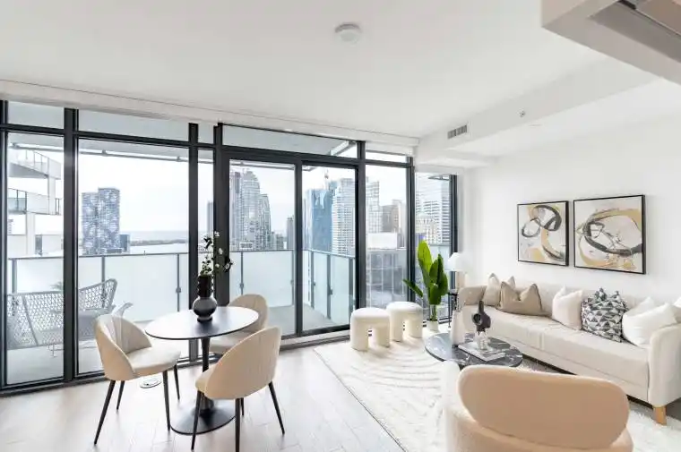 Experience luxury living in the heart of downtown Toronto at Great Gulf’s iconic 20 Lombard! Perched high above the city on the 40th floor, this stunning south-facing 1 bed + spacious den (with doors), 2 bath residence showcases breathtaking views of Lake Ontario. Thoughtfully designed with high-end finishes throughout, this suite features upgraded wood flooring, 9 ft smooth ceilings, custom cabinetry, and a gourmet kitchen complete with Caesarstone countertops and backsplash, premium European built-in appliances, a gas cooktop, and a sleek centre island-ideal for cooking, dining, and entertaining. The bright and airy open-concept living and dining area is framed by floor-to-ceiling windows, filling the space with natural light and highlighting the modern urban design. Step out onto your expansive 234 sq. ft. balcony with two walkouts, a water line, power outlets, and a built-in gas line-perfect for enjoying morning coffee, evening cocktails, or simply taking in the mesmerizing lake and city views. The spacious den offers flexibility to serve as a comfortable second bedroom, home office, or guest space, adapting effortlessly to your lifestyle. This building has an explicit ban on AirBNB rentals. Residents of 20 Lombard enjoy access to an exceptional array of amenities, two fully equipped fitness centres, two outdoor swimming pools, two lockers for extra storage one conveniently located on the 5th floor, a meeting and party room, quiet study areas, and an expansive rooftop deck and garden with panoramic city views. Perfectly situated, you’re just steps from Yonge-Dundas Square, the Toronto Eaton Centre, St. Lawrence Market, and the Distillery District, with King and Queen Street subway and streetcar lines moments away for effortless connectivity across the city.