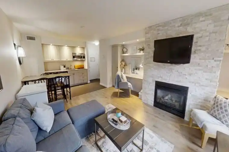 Top-Floor condominium located at Deerhurst Resort, Muskoka living at its best! Welcome to your perfect Muskoka retreat or year-round home! This beautifully updated one-bedroom, one-bathroom top-floor condo is located in the heart of the sought-after Deerhurst Resort. With a modern feel and quality finishes throughout, this unit is ideal for a first-time buyer, single professional, or anyone looking for a cozy cottage escape. The open-concept living space features a bright, airy layout with a natural gas fireplace, kitchen, desk, and more. Step outside to your private balcony with new aluminum and glass railings perfect for enjoying your morning coffee or sunsets. This building has recently undergone a full exterior renovation, including new siding, windows, doors, and balconies, offering peace of mind and long-term value. As an owner, you enjoy full access to resort-style amenities including: indoor and outdoor pools, beach, walking and hiking trails, tennis courts, fitness centre, plus discounts at some of the resort amenities and more! The monthly condo fee of $928.01 covers everything, including water, sewer, hydro, natural gas, cable TV, high-speed internet, and use of recreational facilities at the resort. Annual property taxes ($1,650). HST does not apply to the sale, and a quick closing is available. Whether you’re looking for a maintenance-free Muskoka getaway or a smart investment, this unit checks all the boxes! Don’t miss out schedule your private viewing today!