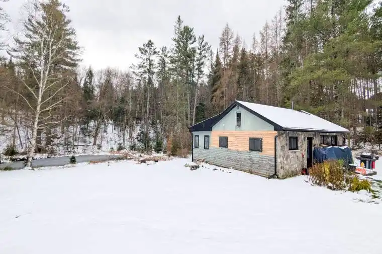 1100+ sqft, 2-bdrm, 1 bath bungalow on 1 acre, with direct access to 1500+ ACRES of CROWN LAND! This incredibly private setting is surrounded by trees and nature, and offers a gentle slope to the pond’s edge. Over $180,000 in upgrades have been completed since 2022 including roof, soffits, facia, eavestroughs, windows, interior and exterior doors, lighting, woodstove, and 14kw Generac. PLUS new fridge, stove, dishwasher, washer and dryer in 2023. New wiring, breaker box (200 amp), plumbing and baseboard heaters in 2016. Add some finishing touches such as trim, some drywall taping, paint, and flooring. It feels 90% complete already! The detached garage, with concrete floor and hydro, is ideal for storage. Affordable lifestyle with 2024 taxes at $1837.48; hydro approximately $109/month; propane $210/2024, and roughly 10 face cord of wood annually. Propane tank and water heater are owned. 7kms to Golden City Lake… paddlers and pets LOVE this opportunity! 25-minutes from Huntsville for access to shopping, dining, entertainment and healthcare.