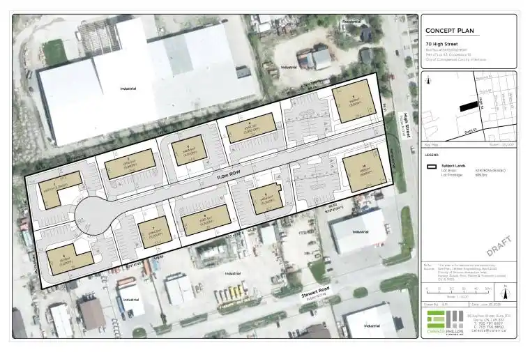 Rare opportunity to own a corner-street front industrial lot in a premier commercial corridor on High Street, directly fronting the roadway for maximum exposure between Home Depot and Home Hardware. With unmatched frontage and visibility, this highly sought-after position serves as a landmark parcel in a high-traffic commercial trade zone. The development consists of privately-owned M5-zoned industrial lots, each sold individually and fully serviced, offering premium positioning for owners or investors. Strategically located in Collingwood’s Official Plan growth area, this site offers elevated long-term value and optimal flexibility for industrial or service-commercial uses. Town water, sanitary sewer, three-phase hydro, and high-speed internet are available (buyer to confirm service connection requirements). A standout chance to secure a fully-serviced, street-front industrial lot in one of Collingwood’s fastest-expanding commercial corridors-ideal for contractors, trades, warehousing, service-commercial users, or investors wanting top-tier visibility.