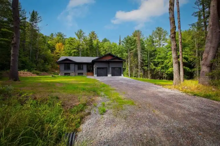 New 3-bedroom 2-bathroom home completed. Large 10-acre private, fully treed country lot between Huntsville and Bracebridge. The land has a stream with wetlands and snowmobile trails close by. It is a short drive to Mary Lake beach. Interior pictures and a 3D tour are of a recently completed home similar to the new build with the same floor plan and similar finishings. The house has a large 20×12 deck with a metal railing, a high-efficiency propane furnace, an HRV system, and Central Air conditioning. Cathedral ceiling in the great room. Open concept layout featuring wide plank engineered hardwood throughout. Full LED lighting, feature walls and stained false beams throughout, a Designer custom kitchen, and quartz countertops. Large entrance foyer and main floor laundry. Oversized molding on both casing and baseboard. Electric fireplace in the living room. Two bathrooms, a 4-piece and 3-piece Primary bedroom ensuite. ICF foundation Tarion warranty. The basement is drywalled with electric outlets and has a second electrical pony panel for easy basement finishing. See plans (attached) for exact measurements. Very close access to Highway 11 and 15 minutes to Bracebridge and Huntsville.