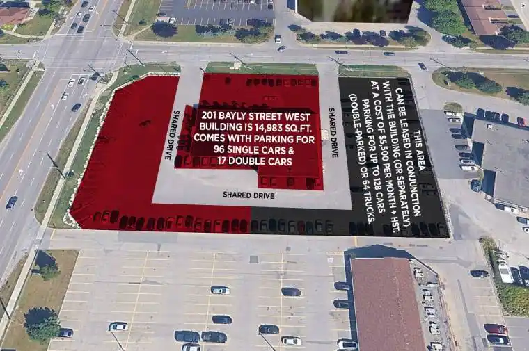 Parking for 128 cars (approx. 50% double parked) or 64 trucks for $5,500 per month + HST. Can be leased in conjunction with MLS #E12628812 or separately.