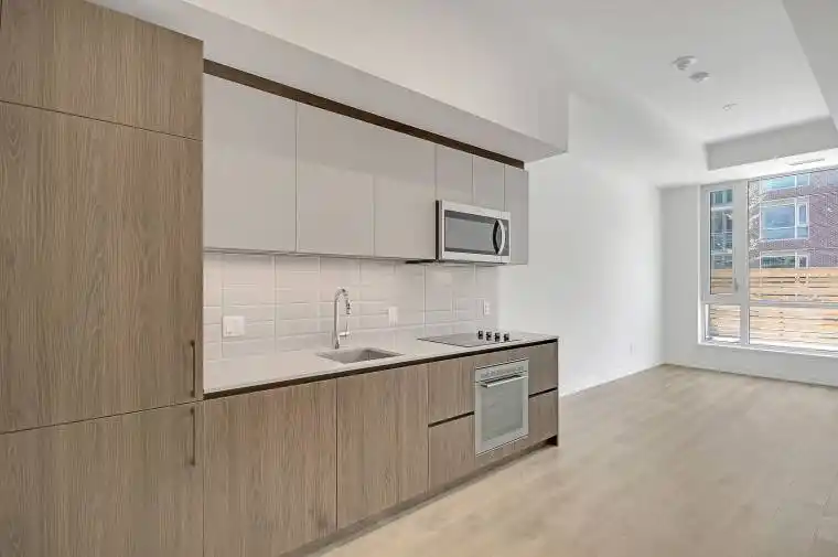 This bright and well-designed 2-bedroom, 2-bathroom Wonder Condos unit offers 705 sq. ft. + 192 sq. ft. private patio. Found in Toronto’s South Riverdale & Leslieville area. The functional layout features 10-foot ceilings and laminate flooring throughout. The living room is enhanced by large windows, offering a comfortable and inviting space. The L-shaped kitchen, combined with the dining room, includes stone countertops and integrated appliances: fridge, dishwasher, cooktop, and built-in oven and microwave. The primary bedroom features walk-out access to the patio, a 4-piece ensuite, floor-to-ceiling windows, and a closet. The second bedroom is in a split bedroom layout with glass swing doors and a closet, offering excellent flexibility as a guest room or office. The rare ground-level patio provides a peaceful outdoor escape with direct access from both the living room and primary bedroom. Residents enjoy access to excellent amenities, including a gym, co-working library, pet wash station, visitor parking, kids’ playroom, partyroom, and rooftop terrace, all within a boutique building seamlessly integrated into the historic Wonder Bread Factory. Steps from Queen Street East, Jimmy Simpson Park, cafes, restaurants, and only minutes to the waterfront, DVP, and downtown core.