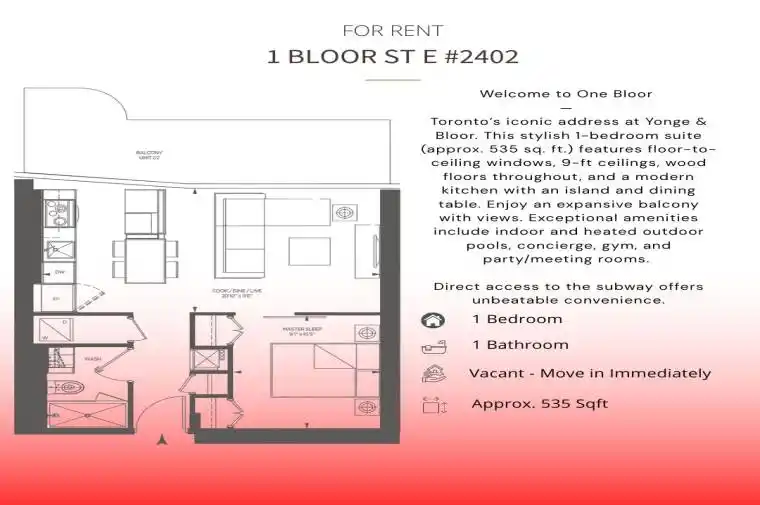 Welcome to One Bloor. Toronto’s most iconic address at Yonge & Bloor. This stunning 1-bedroom suite offers approx. 535 sq. ft. of thoughtfully designed living space with floor-to-ceiling windows, soaring 9 ft ceilings, and wood flooring throughout. Enjoy an unobstructed east-facing view from the expansive balcony, perfect for morning coffee or evening relaxation. The sleek, modern kitchen features a built-in island with a dining extension, ideal for both everyday living and entertaining. Residents enjoy world-class amenities including indoor and heated outdoor pools, a fully equipped gym, party/meeting rooms, and 24-hour concierge service. Direct subway access connects you seamlessly to the entire city. Experience luxury living in the heart of Toronto.