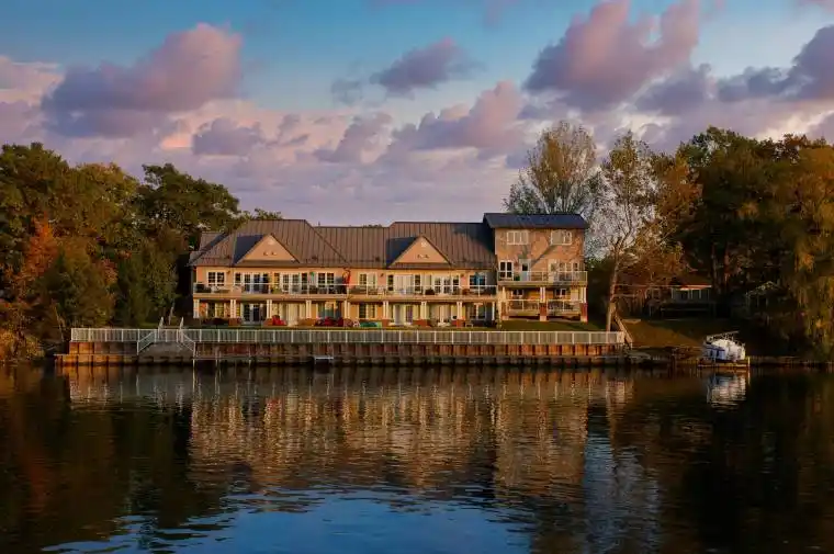 Waterfront Condo on the Nottawasaga River. World-class water views from upper and lower walk-out river-side patios. Enjoy 15 ft of personal seawall. Stylish, light-filled open-concept living and dining space with a gas fireplace. Walk-out lower level, with 2 bedrooms, 2 bathrooms, large open concept living, kitchen and dining with hardwood floors, wall-to-wall windows and 2 parking spots. Rough-In for one EV Charger (electrical only available- buyer to install charging system). LOCATION!!! 5 min walk/paddle to Wasaga’s longest freshwater beach, shopping and state-of-the-art multiplex recreation facility. Direct sunset views of Provincial Park and panoramic views of the Nottawasaga River and Georgian Bay. Quiet, upscale, gated community; majority owner-occupied. ALL summer/winter exterior maintenance, including landscaping & snow removal for the ski crowd. 2 personal parking spots. Lots of storage space plus a future large storage shed pre-approved by the board. Property is also available to lease. Owner can install a dock within their section of the seawall with board approval.