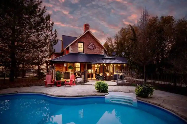 Step into timeless elegance, with this beautifully restored, circa-1850 estate, offering approx 2,873 sq ft of thoughtfully updated living space while preserving rich historical details. Situated on a beautifully landscaped approx 1.9 acre lot with a circular driveway, the home welcomes you with a charming covered front porch and a peaceful back porch, perfect for relaxing. Inside, features abound including wide wood trim, ornate staircase embellishments, vintage door handles, & a stunning stained glass window above the front door – all meticulously maintained. Upstairs, wide-plank wood flooring adds rustic character to all 4 good-sized bdrms. The updated kitchen is the heart of the home, featuring quartz counters, a tasteful tile backsplash, stainless steel appliances, and a large pantry cupboard. It flows effortlessly into a generous-sized dining room with a shiplap accent wall and walk-out to the porch, ideal for entertaining. The living rm offers built-in shelving and classic wainscoting, while a separate family rm, with a custom b/i desk can serve as a cozy retreat or a home office. Main floor laundry rm includes ample cabinetry and a walk-in closet. The primary bedroom boasts two walk-in closets, a 3-piece ensuite, and a private stairway to the main level. A quaint bench seat in the upper hallway adds a cozy, storybook touch, ideal for quiet moments or reading by the window. Outside, enjoy an in-ground pool surrounded by wrought iron fencing, landscaping, and a flagstone patio area. The heated, 3-car garage includes an epoxy floor and a finished loft for extra living space & storage. With recent upgrades including furnace(2022), AC(2025), HWT(2023), newer windows (most updated in the last 4 yrs), plus dependable metal roofing, this exceptional home offers classic beauty with modern reliability. This one-of-a-kind property is more than a home brimming with historic beauty & modern comforts, it offers a lifestyle of charm, convenience & sophistication.