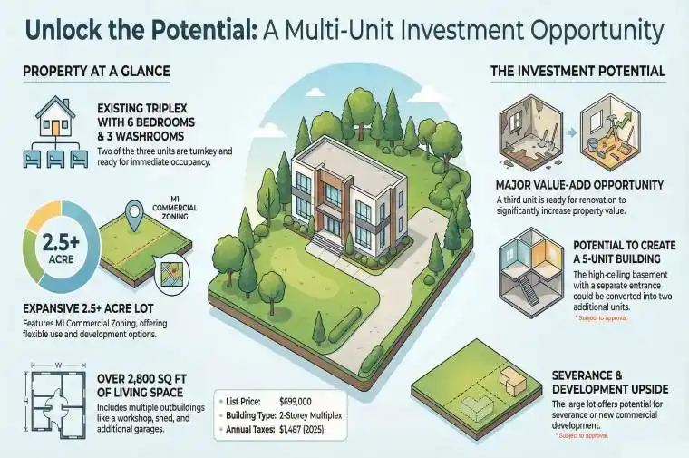 Vacant possession triplex with value-add, development and severance potential on over 2.5 acres within minutes to Highway 401 and approximately 30 minutes to London! 194 Furnival Road is a high-potential investment featuring M1 Commercial Zoning and a layout primed for maximum ROI. Two of the three existing units are turnkey and ready for immediate occupancy, while the third unit offers a significant lift and value-add opportunity for a forced appreciation strategy. For those looking to maximize the property’s density, the high-ceiling basement with a separate entrance is a game-changer, offering the potential to be finished into two additional units to create a 5-unit cash-flow powerhouse. The expansive 2.5-acre lot provides even more upside through potential severance or commercial development right in the heart of Rodney. This property is a dream for investors seeking a strategic project, or end-users looking for a substantial mortgage helper with massive future equity growth. Ideally located within walking distance to local shops and just 10 minutes from the New Glasgow Yacht Club and the beaches of Port Glasgow, this versatile estate allows you to set your own market rents and start building equity on day one.