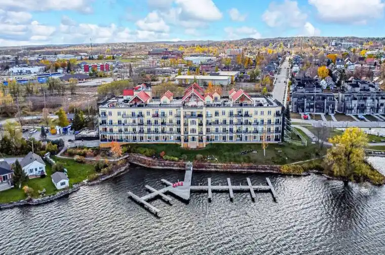 2,208 SQ FT PENTHOUSE WITH MASSIVE ROOFTOP TERRACE, PRIVATE BALCONY, 2 PARKING SPOTS, LAKE VIEWS & RARE PRIVATE DOCK SLIP! Here’s your chance to own the crown jewel of Elgin Bay Club, a highly sought-after waterfront penthouse with over 2,200 sq ft of light-filled living space and jaw-dropping views of Lake Couchiching. This bright corner unit features an expansive private rooftop terrace with panoramic views of the lake and Orillia skyline, plus a balcony with a glass sliding walkout overlooking the marina, waterfront park, and downtown. Minutes to shops, dining, trails, parks, beaches, and a marina, this prime location is all about lifestyle. The kitchen offers white cabinets with some glass inserts, granite counters, a bold black/white tile backsplash, an updated built-in oven and cooktop, a large pantry and a breakfast nook. The expansive living and dining areas are anchored by a gas fireplace and feature dual furnace systems with separate heat controls. The generous primary bedroom includes a sitting area, a walk-in closet and a 4-piece ensuite with a glass shower, jacuzzi tub and massive vanity. A 4-piece main bath serves the second bedroom. Bonus second-level loft with a walkout offers added living space and flexible use. Newer vinyl flooring is featured throughout most areas, with in-suite laundry and ample storage adding everyday convenience. Two owned parking spaces, one underground and one outdoor, an exclusive storage locker, make daily living easy. Residents enjoy amenities including a party/meeting room, rooftop deck, community BBQ and visitor parking. Enjoy exclusive ownership of one of Elgin Bay Club’s rare private dock slips, as one of the few residences with this privilege, so you can pull up on your boat, store your kayak, and savour waterfront living! Fees include water, parking, building insurance and common elements. Opportunities like this are few and far between – make this rare waterfront penthouse your #HomeToStay before someone else does!