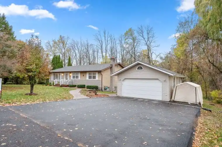 Welcome to this charming 3-bedroom bungalow set on a beautifully treed 0.64-acre lot in rural Brighton, just a short drive to local shopping, schools, and all the amenities of downtown. This well-maintained home offers a traditional floor plan featuring an oversized living room and an updated kitchen complete with a centre island, abundant cabinetry, and generous counterspace. The adjoining family room includes two walkouts-one to a south-facing garden area and another to an east-facing deck with a covered gazebo, perfect for outdoor entertaining. The primary bedroom includes a convenient 2-piece ensuite, while two additional bedrooms and a 4-piece main bath complete the main level. The lower level provides excellent additional living space with a large recreation room featuring a cozy woodstove, a separate office, a workshop area, and a walkout to the backyard. Additional property highlights include a detached two-car garage with workshop space, a double asphalt driveway, and two storage sheds for garden and equipment needs. This property offers the perfect blend of rural tranquility and easy access to town conveniences – ideal for families or those seeking peaceful country living