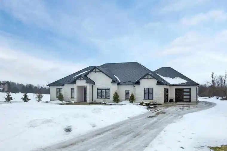 This custom built bungalow, completed in 2023, sits on just under 10 acres and offers a rare mix of modern comfort, quality finishes, and space to enjoy the land. Featuring 3 bedrooms and 3 bathrooms, the home is thoughtfully designed for both everyday living and long term comfort.The foyer welcomes you with marble flooring, in floor heating, and tall ceilings, setting the tone for the rest of the home. The open concept main living area flows naturally and is filled with natural light from large south facing windows. A floor to ceiling stone fireplace anchors the living room and creates a warm, inviting space year round.The kitchen is both functional and well designed, featuring floor to ceiling cabinetry, quartz countertops, stainless steel appliances, a farmhouse sink, and a large island for everyday use. A walk through pantry connects to the formal dining room, offering flexibility for hosting or quieter meals. Built in cabinetry with floating shelves and a bar fridge adds a practical accent and additional storage. Patio doors lead to a covered outdoor living area for easy indoor outdoor flow.The primary bedroom is spacious and bright, with a well appointed ensuite that includes double vanities, a large walk in shower, and a walk in closet. Two additional bedrooms, a dedicated office, mudroom, and generous laundry room complete the main level. Everything is located on one level for easy, efficient living.Two attached garages with in floor heating provide plenty of space for vehicles, storage, or workspace.A standout feature of the property is the approximately 40 x 70 heated shop, complete with in floor heat, large overhead doors, a washroom, and office space.Set on just under 10 acres, this property offers privacy, open space, and room for projects, hobbies, or simply enjoying the outdoors. A newer build that combines thoughtful design, luxury finishes, and practical country living.