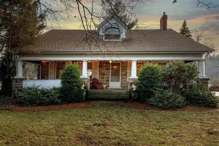 Welcome to Langside, also known as the historic Jacob Smith House, a beautifully restored stone farmhouse built in 1847 and set on an expansive 104 x 280 ft lot (almost 3/4 of an acre) at the edge of the Niagara Escarpment. Rich in Loyalist history, this landmark home blends Neo-Classical architectural details with thoughtful modern upgrades (2021) completed by Heartwood Renovations. Inside, engineered hardwood floors, exposed beams, and original character elements pair seamlessly with a chef-inspired kitchen featuring quartz countertops, gas range, premium appliances, a large island, and walk-in pantry. Multiple living spaces include two gas fireplaces, a bright rear family room, and a main-floor laundry with built-in storage. Upstairs provides spacious bedrooms with built-ins, including a sun-filled primary suite. Additional features include central vacuum, attached one-car garage with inside entry and ample storage. Enjoy peaceful farmland views from the covered front porch, a timeless property featuring privacy, character, and enduring craftsmanship.