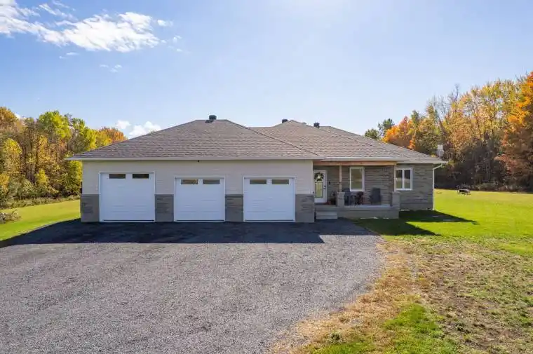 This 2024 custom-built 4-bedroom bungalow delivers approximately 1,670 sq. ft. of intelligently designed living space on a pristine 7.5-acre country setting that offers privacy, efficiency, and future expansion.. Constructed on a full ICF foundation with 9′ basement ceilings, the home is engineered for efficiency and longevity, complete with a Generac backup generator powerful enough to run two homes. From the moment you step inside, quality craftsmanship is evident. The open-concept main level features a striking kitchen with birch soft-close cabinetry, built-in double oven/microwave, oversized centre island, and dedicated coffee bar-perfectly flowing into a bright living room with a custom entertainment unit and access to a covered rear porch ideal for relaxing or entertaining. Car enthusiasts, hobbyists, and trades will appreciate the impressive 1,250 sq. ft. triple attached garage, featuring in-floor heating, arena-style lighting, and three dedicated breaker zones-designed to function as a serious workshop. Heating is efficiently supplied by an outdoor Heatmor wood furnace and/or propane system, providing domestic hot water and in-floor radiant heat to both the home and garage. Additional upgrades include an over-insulated attic, in-floor basement heating with separate garage access, pre-run conduits for future Fibe/internet, full home network wiring with multiple Wi-Fi boosters, gas BBQ hookups, and a security system with backup power. With approval potential for a secondary dwelling or shop, and well and septic systems designed for expansion, plus a second driveway already in place, this property offers exceptional flexibility for multi-generational living, income potential, or future growth. A rare opportunity to own a modern country home with superior utility systems, intelligent design, and room to grow. Please allow 24-hour irrevocable on all offers.