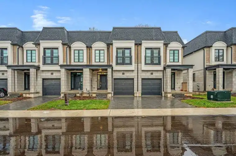 Welcome to Unit 24 at The Vineyard Townhomes, a refined French-inspired community ideally located on Elgin Street North. Designed with timeless architectural details including elegant stonework, arched rooflines, and sleek black accents, this residence offers a rare blend of style, comfort, and privacy. Positioned near mature trees, the home enjoys a peaceful backdrop seldom found in townhome living. Step inside to discover 9-foot ceilings, wide plank flooring, and abundant natural light throughout the main level. The thoughtfully designed open-concept layout creates a seamless connection between living, dining, and kitchen spaces, ideal for both everyday living and entertaining. The kitchen features stone countertops, a generous island with seating, crown moulding on cabinetry, tile backsplash, under-cabinet lighting, and an undermount stainless-steel sink, combining function with modern sophistication. Adjacent dining and living areas are bright and inviting, with large windows and a walkout overlooking the treed outdoor setting. The upper level offers a well-appointed primary suite with room for a king-size bed, a walk-in closet, and a private ensuite complete with a rain shower and pressure-balanced fixtures. Two additional bedrooms provide flexibility for family, guests, or a home office, while second-floor laundry adds everyday convenience. The unfinished basement offers excellent future potential for additional living space, a recreation area, or storage. Built with efficiency and long-term value in mind, features include triple-glazed energy-efficient windows, a 30-year asphalt shingle roof, R-60 attic insulation, ERV system, smart programmable thermostat, insulated garage door, poured concrete porch, fully sodded lot, 100-amp electrical service, gas-fired rental hot water heater, and two exterior water taps. Conveniently located minutes from parks, schools, shopping, transit, and with easy access to Highway 401 and Highway 8. *Virtually staged*.