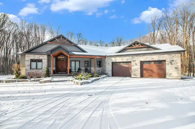 Prepare to discover the pinnacle of luxury country living in this breathtaking custom designer-built estate, perfectly poised on a premium, private treed lot just shy of four acres. Imagine waking up to mornings flooded with light, where the cathedral ceilings soar above elegant wood beam accents, setting the stage for unforgettable gatherings around the colossal 11-foot quartz island that anchors the open-concept gourmet kitchen, complete with a massive walk-in pantry and walls of fenestration framing serene outdoor views. The main floor offers a private sanctuary in the primary suite, boasting a walk-through closet, a highly upgraded ensuite with custom solid wood vanities and a large soaker tub, and direct access to a cozy, fireplace-warmed sunroom-your perfect year-round retreat. From the double attached garage, a large mudroom and main-floor laundry ensure family life stays organized, while two spacious children’s bedrooms are connected by a high-end Jack and Jill washroom and a charming, flexible nook area, ideal as a reading retreat or homework station. The lower level is an entertainer’s dream playground, featuring a sprawling bar area, a dedicated movie room for cinematic nights, and a generous kids’ playroom beside it. Also on the lower level, a fourth bedroom, a fully equipped gym, and convenient walk-up garage access-perfectly accommodating multi-generational living. This dream is complete with an absolutely massive detached shop (32ft x 48ft) , featuring two large bays, a third side bay, and a loft, providing an incredible space for storing every toy and piece of equipment, cementing this home as the ultimate rural escape, truly overflowing with too many high-end, custom finishes to count. Don’t miss out, book your private visit today!