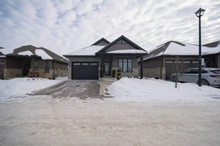 Welcome to this beautifully maintained 2+1 bedroom, 3 bathroom bungalow in the charming small town of Jarvis- voted as “Canada’s Kindest Community” and just a short drive to the beaches and amenities of Port Dover. Nestled within a quiet, welcoming neighbourhood that still fosters a strong sense of community, this common elements condominium offers a thoughtful layout, modern finishes, and comfortable one-floor living with a fully finished basement-ideal for downsizers, professionals, or those seeking low-maintenance living. The main floor boasts engineered oak hardwood in the principal rooms, a versatile front bedroom/den with double doors, and a 4-piece guest bathroom with tiled floors and tub/shower combo. The bright kitchen offers white shaker cabinetry, quartz countertops, subway tile backsplash, peninsula, and stainless steel Frigidaire appliances. The open living/dining area includes a natural gas fireplace and patio doors that lead out to the backyard. The primary suite features a walk-in closet and a 3-piece glass shower ensuite, plus convenient main-floor laundry with garage access. The fully renovated (2022) basement provides a spacious recreation room with shiplap accent walls, sconce lighting, and an electric fireplace-ideal for relaxing or entertaining-along with a large bedroom featuring a proper egress window and generous closet, plus ensuite privilege to a stylish 3-piece bathroom with glass shower. Step outside to the covered backyard patio, a perfect space to enjoy your morning coffee, host summer dinners, or unwind in any season. Thoughtfully designed, move-in ready, and located in a welcoming community that offers small-town charm with nearby lakeside access, this home delivers comfort, style, and easy living-an excellent opportunity in Jarvis.
