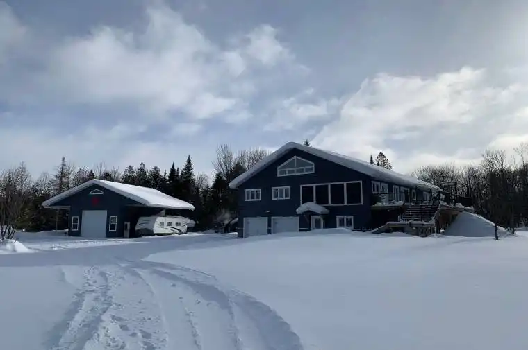 NOW HOOKED UP TO HYDRO! This truly unique north Muskoka living experience boasts 24+ acres complete with a beautiful 12′ deep spring fed pond & sandy beach area ~ perfect for swimming in! Only 15 min north of Huntsville with trails throughout the property + sugar maple trees to make your own syrup & tons of firewood to feed the outdoor boiler. Built in 2015, this lovely family home was designed for self sufficiency in mind including ICF to the rafters to maximize energy efficiency. Recently connected to hydro grid with solar power & generator back-up. Enjoy 3400 sf on 3 levels making this the perfect multi-generational home. The ground floor (in-floor heat) offers a larger foyer, 2 guest bedrooms, 3-pce bath, utility rm, super large mudroom w/loads of storage + access to the oversized dbl garage. The adjacent workshop with W/O is a bonus while the convenient “dumb waiter” in the mudroom transports your groceries to the kitchen above! Main floor offers an open concept plan with a very spacious kitchen that features a new backsplash, loads of oak cupboards, pantry & 9′ island. Good sized dining & living areas provide the ideal entertaining space w/access to the jumbo sized sundeck & 10×20 3-season Muskoka rm overlooking the pond. You will also find a 2-pce powder rm, laundry & office/nursery off the primary bedroom complete w/5 pce ensuite, WIC & W/O to your own private deck. The 3rd level hosts a 4th bedroom & spacious games room/workout space w/exceptional views of the pond. Many outbuildings include a chicken coop, insulated Bunkie, 32×28 pole barn for all your equipment & wood shed. The best part is the 24’x34′ detached garage/shop with carports on either side for storing your RV, boat or tractor. Cozy in-floor heat so you can work on yourequipment throughout the winter. This property is truly a hidden gem especially for those that love the outdoors. Snowmobiling, ATVing, hiking, hunting or simply enjoying the beautiful surroundings~it’s all here waiting for you!