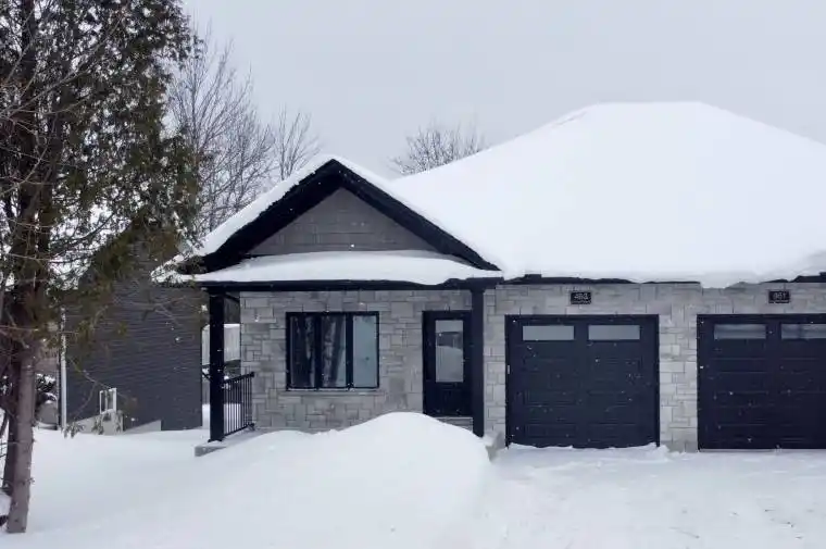 Brand new semi-detached bungalow with walkout basement by Candue Homes! Backing onto mature trees this home is thoughtfully designed, blending modern finishes with a peaceful natural setting. The bright, open living room features a stylish shiplap fireplace and a walkout to the covered back deck, creating a seamless indoor-outdoor connection with tranquil treed views. The kitchen is finished with quartz countertops, a tile backsplash, and all appliances included.The primary bedroom has a walk-in closet with custom organizers and a beautifully finished ensuite bathroom featuring double sinks and a custom tiled shower. Practical touches include main-level laundry and an attached garage. The lower level expands your living space with a spacious recreation room and walkout to the backyard with a concrete patio. On this level you’ll also find a 3rd bedroom & bathroom, plus ample storage, making it a great space for hosting guests. Outside, the builder includes a paved drive, fully sodded lot, and a fence along the east side of the back yard for added privacy. Cedar trees will be planted along the inside of the retaining wall at the back.