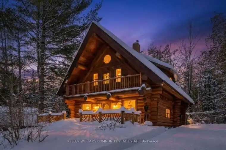 Situated in the village of Burnt River, while still being tucked away from the everyday, this 2.5-storey Scandinavian-style log home feels like stepping into your own private world – quiet, natural, and the perfect mix of manicured landscaping and untouched forest. With 1.5 acres of open yard space and the rest of your 27 acres being forested trails, it’s a haven for nature lovers, gardeners, and anyone craving room to grow and explore, or just breathe. Inside, a floor-to-ceiling stone fireplace anchors the kitchen and living area with instant warmth and rustic charm.The main floor also includes a flexible bedroom/office, a 3-piece bath, and a bright 3-season sunroom that feels like a fairy tale whether it’s raining or the sunniest day on earth! From here you can head outside and down enchanting stone steps into your own greenery sanctuary. Upstairs offers three bedrooms, including a spacious primary with a bonus room currently used as an incredible walk-in closet, easily repurposed as an office or private retreat. Another full bathroom completes this level. The third-floor loft adds a playful touch, ideal for reading, relaxing, or a kids’ hideaway.The finished walkout basement expands your living space and features a wood stove, which is a pleasant touch on those colder days. Outside, you’ll find a triple-car garage (with 100amp service) with 1,000 sq. ft. of finished loft space above for guests, work, or hobbies, plus an 8×2 garden shed and an 10×24 drive shed for your tractor and toys. This is more than a home, it’s a lifestyle. Mornings with birdsong, afternoons on wooded trails, evenings by the fire. Rustic charm and modern comfort meet here. Conveniently located near small-town essentials: Kinmount (14 minutes), Fenelon Falls (15 minutes), Bobcaygeon and Minden (~30 minutes), and direct access to the Victoria Rail Trail (ATV/snowmobile trails) a boat launch at the end of Hillside drive, and close proximity to Four Mile Lake and Crystal Lake.