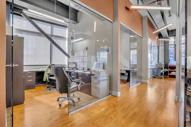 Stunning and functional office space available at the prestigious King James Building! This impeccable suite offers 2,500 square feet of tastefully restored and renovated space, six private offices, private balcony, glass-enclosed boardroom, kitchen, in-suite washrooms (including one fully-AODA compliant), storage closets, exposed ductwork, post-and-beam construction, and access to the fifth floor common area terrace! Serviced by a fob-secured elevator that opens directly into the suite, this newly-available office is prodigious and practical. The building itself has been completely redeveloped by Core Urban; known for their brilliant combination of preserved heritage features and character with modern features and building systems. Located in the heart of downtown Hamilton, this suite is literal steps away from the major banks, City Hall, the court houses, McMaster University’s downtown campus, the James North Arts district, Jackson Square, the King William restaurant district, and so much more! Available today! Note: furniture shown in photography belongs to prior tenant and not available for use.