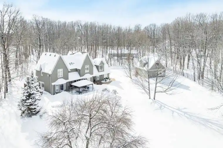 Top 5 Reasons You Will Love This Home: 1) Set on over 18 rolling acres just outside Flesherton, this picturesque estate unfolds with a winding driveway through mature trees, opening to panoramic views across Beaver Valley toward Old Baldy and Kimberley, offering privacy and country living 2) Spacious 3,815 square feet designed for multi-generational living, offering four bedrooms and five bathrooms, ideal for large families, extended family living, or those who love hosting, with a thoughtful layout providing open gathering areas and private retreats 3) Character, warmth, and timeless finishes define this residence, where antique hardwood floors crafted from reclaimed barn wood flow throughout, while the main level unfolds with a spacious kitchen with granite countertops, pantry, and abundant wood cabinetry, a bright dining area with large windows, an expansive living room with walkout to back deck, a private office or den, and a convenient powder room 4) Flexible living spaces with a separate apartment enhance the home’s versatility, with an upper level primary suite offering panoramic views, a walk-in closet, and 5-piece ensuite with skylight, while the opposite wing features potential private quarters with a bedroom, semi-ensuite bathroom, living room, and kitchenette, perfect for in-laws, plus a finished basement with an extra bedroom and full bathroom, and a fully self-contained apartment with separate entrance to the main level living space, with spiral staircase leading to the bedroom and bathroom 5) Exceptional outbuildings and a four-season lifestyle set this property apart, featuring a detached double car garage with unfinished loft along with three impressive outbuildings, while front and back decks capture sweeping views and provide the perfect place to unwind, while remaining just a short drive to Lake Eugenia, waterfalls, hiking trails, ski hills, Collingwood, and Blue Mountain. 2,825 above grade sq.ft. plus a finished basement.