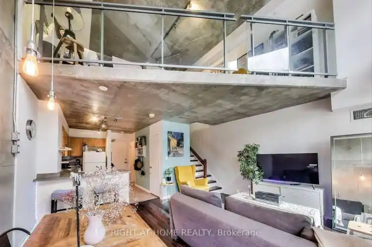 Welcome Home to Unit 246 at 1029 King St W – a bright and spacious 1-bedroom + den, 2 bath, 2-level loft in the sought-after Electra Lofts. Boasting approx. 810 sq.ft. of Bauhaus-inspired design, this south-facing unit is flooded with natural light through dramatic double-height windows. The open-concept layout features soaring ceilings in the living area, upgraded modern glass and steel railings on the upper level, and a sleek urban vibe throughout. Enjoy the perfect blend of style and function, with a generously sized bedroom (opened up wall separating the den), and an oversized 6′ x 6′ private storage locker included. Live in one of Toronto’s most dynamic neighbourhoods steps from trendy restaurants, nightlife, transit, parks, the Bentway, and everything downtown has to offer. Whether you’re entertaining at home or exploring the city, this is the ultimate King West lifestyle.