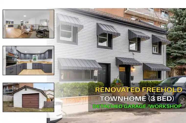 FREEHOLD TOWNHOUSE that’s been Updated inside and out. BEST PRICED 3 BED FREEHOLD. Enjoy peace of mind with UPDATEDPLUMBING, WATERLINE, ELECTRICAL & HVAC. Modern FINISHES throughout the home with updates to the kitchen, flooring and more. Outside, the EXTERIOR IS REDONE FRONT & BACK, featuring a Detached GARAGE or WORKSHOP with HYDRO/GAS in a LANEWAY for storage/work. EXTRA PARKING (RARE) . A MOVE-IN READY opportunity with quality updates throughout and the convenience of NO CONDO FEES.