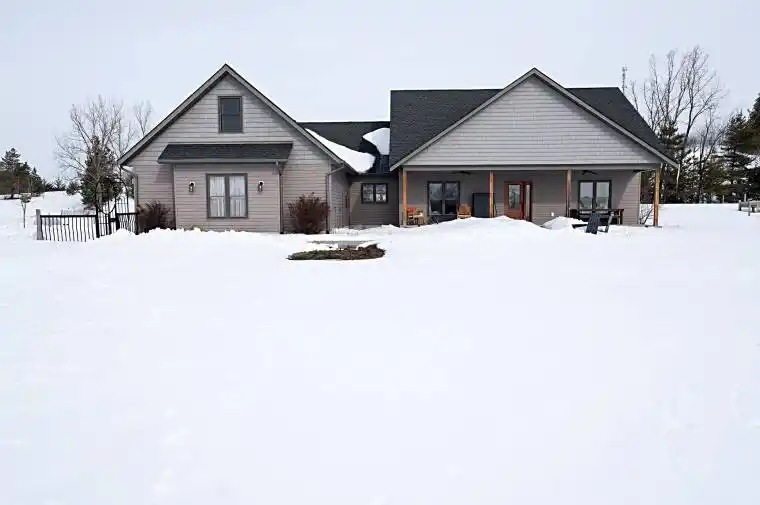 Stunning views surround this impeccable 4-bedroom, 3-bath home set on a private 2.7-acre lot overlooking Lake Ontario. Built with Premier SIPS (structural insulated panels) and slab-on-grade construction, the home offers exceptional energy efficiency and durability. The main level features in-floor radiant heat, porcelain flooring throughout, 9-foot ceilings, and a spacious eat-in kitchen with abundant cabinetry and a generous walk-in pantry. The living room stands out with its 10-foot coffered ceiling and wood-burning fireplace, creating a warm and inviting focal point. A large loft over the garage adds valuable flexibility-ideal for a potential in-law suite, studio, or hobby space. Outdoor living is effortless with covered front and back porches, perfect for enjoying the peaceful surroundings and scenic views. The insulated double-car garage adds year-round comfort and convenience. This property blends privacy, modern comfort, high-performance construction, and breathtaking natural beauty-an exceptional retreat just moments from Lake Ontario.