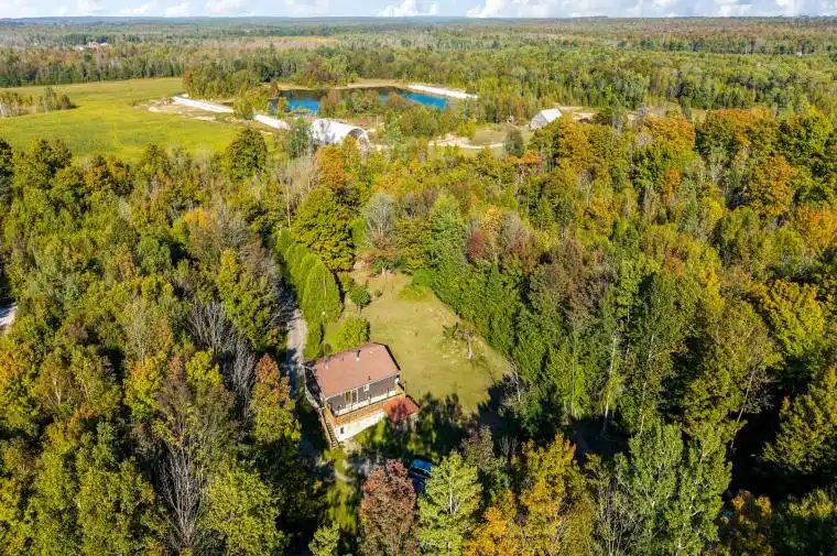 Country Home or Cottage Retreat on 25 Beautiful Acres. Embrace the tranquility of nature in this raised bungalow, set on 25 acres featuring a mix of open land and mature trees. Follow the trail to a secluded meadow that extends to the back of the property to more trails, perfect for family gatherings or a quiet escape from the bustle of town. With a barn, garage, and even a sugar shack, there’s plenty of space for storage, hobbies or outdoor adventures. Garden lovers will enjoy apple and pear trees, strawberries, and mor, an ideal canvas to cultivate your green thumb. Inside, the spacious foyer welcomes you to the lower level, complete with recreation room, den, 2 piece bath, and convenient main level laundry. Upstairs the open concept kitchen, dining and living areas showcase peaceful treed views. Step out onto the balcony for BBQs and entertaining. This home offers great potential for families or anyone looking to add their person touch. Recent updates include new exterior siding, Roxul insulation on both levels, some new doors and windows, new woodstove, and basement drywall. Ideally located close to Wiarton, Sauble Beach, and Owen Sound.