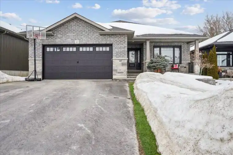 Welcome to this stunning, custom-built executive bungalow, perfectly situated on a quiet cul-de-sac in a premier family neighborhood. This “model-home” style residence offers an impeccable blend of high-end finishes and functional living space, boasting 4 spacious bedrooms and 3 bathrooms. Bathed in natural light, the main floor features an open-concept layout with soaring ceiling treatments, pot lights, and premium blinds. The heart of the home is a dream kitchen, equipped with stainless steel appliances, a built-in wine rack, gorgeous quartz countertops, custom cabinetry, and a massive eat-in island. The Family room centers around a grand stone thermostat-controlled gas fireplace, creating a cozy atmosphere. The primary master suite features a walk-in closet and a renovated 5-piece ensuite with a custom-tiled shower and a beautiful freestanding tub. There’s also an additional bedroom located on the main level equipped with murphy bed. The professionally finished basement is an entertainer’s delight, featuring a massive great room, two additional large bedrooms with a full washroom and oversized laundry. Step outside to your private backyard, featuring a fully covered deck with a privacy enclosure overlooking a fenced yard. The exterior is complete with a stone entrance, covered front porch, and an oversized driveway with no sidewalk, accommodating 4 cars. The finished double-car garage comes equipped with a newly installed EV charging plug. Enjoy unparalleled convenience just minutes from CFB Trenton, the 401, and the Trenton Memorial Hospital. You are walking distance to local parks, and only a short drive to the Trent Port Marina, world-class golf courses, and the gateway to Prince Edward County. This is a stunning home that truly has it all, don’t miss your chance to own this incredible place.