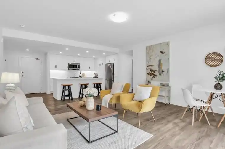 Welcome to effortless modern living in this beautifully built 2-bedroom, 2-bathroom condo offering 1,275 sq ft of thoughtfully designed space. Completed in 2023 by Keating Construction, this home delivers the perfect balance of contemporary style, functionality, and convenience. Situated on the most desirable side of the building, this unit benefits from excellent natural light throughout the day, giving the home a bright and inviting feel. Its main-floor location means no elevator trips or stairs, making everyday living simple and accessible. A unique advantage of this unit is the balcony access at ground level, allowing you to easily pass groceries or larger items directly inside. Inside, the layout is designed with comfort and flow in mind. The open living and dining space creates a welcoming area for relaxing or entertaining, while large windows help fill the home with natural light. Just off the living area, the private balcony provides a perfect spot to enjoy fresh air, morning coffee, or an evening unwind. The kitchen offers sleek cabinetry, modern finishes, and plenty of counter space, making meal prep easy whether you’re cooking for yourself or hosting guests. The primary bedroom includes a private ensuite bathroom and ample closet space, creating a comfortable retreat at the end of the day. The second bedroom is well suited for guests, a home office, or flexible living space depending on your needs.Whether you’re a first-time buyer, downsizing, or looking for a low-maintenance investment, this nearly new condo offers modern construction, smart design, and unbeatable convenience in a well-planned community.