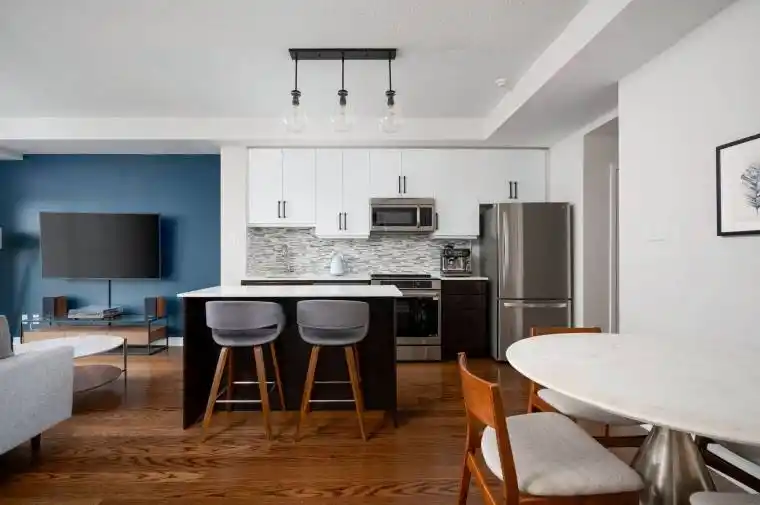 Turn-key and thoughtfully designed, this west-facing 1-bedroom offers a smart, efficient layout with no wasted space and distinct areas for living, dining and everyday life. Dark flooring grounds the space, while the kitchen pairs white counters and upper cabinetry with contrasting base cupboards for a clean, modern look. A large island, upgraded stainless steel appliances, mosaic tile backsplash and generous storage make the kitchen as functional as it is polished, flowing naturally into proper dining and living areas rarely found in a one bedroom layout. Floor-to-ceiling windows bring in afternoon light and open to a west-facing balcony. The bedroom is well-proportioned and includes a walk-in closet, while in-suite laundry and thoughtful finishes throughout add to the suite’s refined, move-in-ready feel. The building is currently undergoing a full renovation of its common areas, with renderings in the listing photos showcasing the updated design and the rare combination of a like-new feel and the space and functionality of an established condo. Set at Queen and Gladstone, this is a low – maintenance home with style, substance and everyday practicality in one of Toronto’s most established west-end pockets.