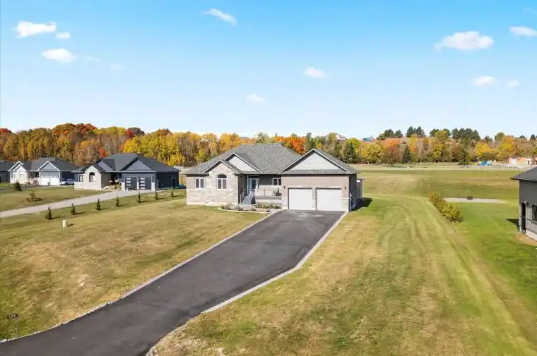 Welcome to 172 Glens of Antrim Way, a beautifully designed detached bungalow set on approximately 1 acre in an exclusive enclave of just six custom homes, featuring the highly sought-after “Brimely” model. Offering the perfect blend of privacy, space, and modern comfort, this home is ideal for those seeking peaceful country living without sacrificing convenience.Step inside to a bright open-concept layout designed for both everyday living and entertaining. The impressive great room features soaring ceilings and a striking modern fireplace feature wall, creating a warm and inviting focal point. The chef-inspired eat-in kitchen is both stylish and functional, complete with sleek white cabinetry, modern appliances, a contemporary backsplash, pantry storage, and a large centre island perfect for gathering with family and friends. A convenient walk-out leads to the patio and expansive backyard, creating seamless indoor-outdoor living.This thoughtfully designed bungalow offers 3 spacious bedrooms and 2 full bathrooms. The primary suite serves as a private retreat, featuring a generous walk-in closet and a luxurious upgraded ensuite with heated floors. The additional bedrooms are bright and well-proportioned, ideal for family, guests, or a home office.The property welcomes you with a long private driveway accommodating up to 10 vehicles and a charming front porch that enhances the home’s curb appeal. The expansive one-acre lot provides exceptional privacy and endless potential for outdoor enjoyment.Located under an hour from the GTA and just minutes from the charming lakeside town of Cobourg, you’ll enjoy easy access to shops, restaurants, golf, and Lake Ontario while still enjoying the tranquility of country living.A rare opportunity to own a modern custom bungalow on a private acre in a sought-after community.
