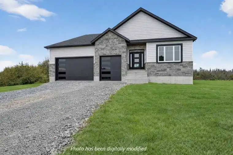 Just 6 minutes west of Kingston, this brand new MacAdam Homes custom-built 1800+ sf bungalow offers 2+2 bedrooms and 3 baths on a very private 3.1-acre parcel of land. With over 3000sf of upscale living space and an attached triple-car garage, this home will be sure to impress even the most discerning of buyers. Your oversized kitchen has an extra-large island, quartz countertops, a walk-through butler’s pantry and is open to both a dining area and great room that overlook the covered rear deck and yard through stunning 10ft patio doors. The spacious master has a luxurious ensuite that features a stand-alone soaker tub, walk-in tiled/glass shower and a quartz-topped double vanity. The largely finished and very bright walk-out lower level includes a massive rec room with electric fireplace and TV hookup above. The home’s additional features of note include open floor plan with 9ft ceilings; propane fireplace with custom surround; main floor laundry; oversized windows on both levels; hardwood and ceramic throughout. The upgraded insulation package with foam beneath the ground level concrete slab and additional R7.5 foam on main floor exterior walls, provides extra comfort and minimizes energy costs. This home has it all. For buyers willing to act quickly, there is still an opportunity to select your own exterior finishes! Call to book a showing before it’s too late.