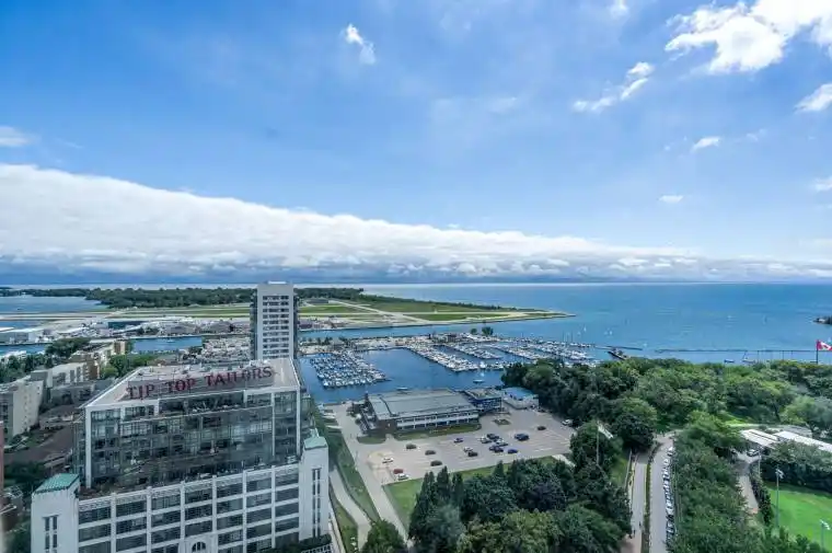 Looking for a large, almost 1400 sq ft condo in Downtown Toronto with parking and locker? This is the one you want. A beautifully spacious 2 bed+den, two bathrooms, two balconies (110 sq ft total), SE corner unit with stunning uninterrupted panoramic views of Lake Ontario, Toronto Islands, Coronation Park and the CN Tower. Designed by Quadrangle Architects, this building offers high-end living in the popular waterfront district. The site is part of the revitalization of the historic Fort York area, offering a great mix of urban energy and waterfront proximity. Engineered hardwood floors, floor-ceiling windows, 9 ft ceilings, granite countertops, marble bathroom vanity and floor tiles, upgraded AC / Ecobee thermostats, and quality Farrow & Ball paint in 2024 all make this a well-maintained and luxurious home. The primary bedroom includes a generous walk-in closet and 4 pc ensuite bathroom. The second bedroom is adjacent to the second bathroom for your guests’ convenience. If you need to use the den as a home office, or as an additional guest room, the French doors will give you privacy. Every single room has windows and natural light, and two South exposure balconies complete the picture. The Harbour Club, located on the 11th floor is for the exclusive use of residents and their guests and features an indoor pool with 12 ft high floor-to-ceiling windows offering panoramic views, a whirlpool hot tub, wrap-around promenade deck and terrace with loungers, BBQ area, cardio room, weight training room, yoga room, theatre room and party room. Guest suites and a library are on the 2nd floor and a landscaped courtyard garden is available for residents’ use. With ample visitor parking and fob-controlled, secure bike lockers on the ground level, this building has it all!