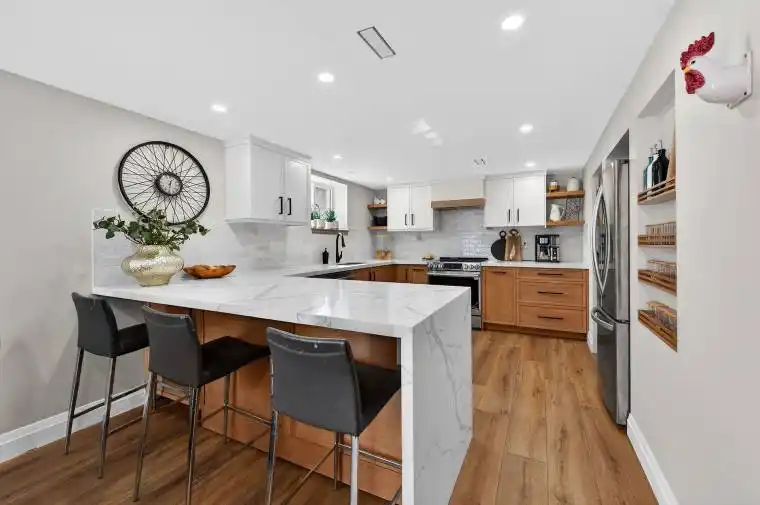 PERFECT MULTI FAMILY LIVING! EXTENSIVELY RENOVATED BUNGALOW (2024/2025) IN SOUTH BURL. 3 + 2 BEDS, 2 FULL BATHS AND 2 NEW CUSTOM KITCHENS. QUALITY UPDATES INCLUDE NEW FINISHES THROUGHOUT, SPRAY FOAM IN THE BASEMENT, TANKLESS WATER HEATER (OWNED), WINDOWS, SHINGLES, 200 AMP PANEL, POTLIGHTS, COLD PLUNGE, BACKVALVE, CUSTOM SOLID WOOD CABINETS IN OFFICE, CLOSET ORGANIZERS. THIS HOUSE CHECKS YOUR BOXES!