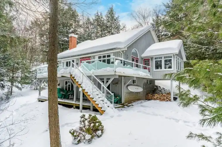 Discover the ultimate private lakeside retreat on prestigious Redstone Lake. Boasting 440 feet of stunning lake frontage on a point lot promises unparalleled privacy and breathtaking views with west, north and east exposures. Discover the perfect blend of comfort and serenity with this exquisite 4-bedroom, 3-bath home or cottage. Step into this 4-season, almost 2980 total sq ft retreat and immediately be drawn to it’s thoughtful lay-out and large windows to bring the outdoors in. The spacious entryway is complete with a mud and laundry room combo and opens to the spacious principle rooms with plenty of room for entertaining family and friends. The open concept living and dining areas feature cathedral ceilings, hardwood flooring, lots of windows, 2 walk-outs to a large deck and a stone wood-burning fireplace perfect for those chilly evenings. The large kitchen features plenty of cupboards and granite countertops with direct access to the 4-season sunporch – ideal for enjoying the beauty of every season – and summer sunsets. Completing the main floor is a 3-pce bathroom and the primary bedroom with a walk-in closet and walk-out to a deck overlooking the lake. Head upstairs to 2 more spacious bedrooms and a 4-pce bathroom. The walk-out lower level features the 4th bedroom, a 3-pce bathroom, a large rec room with a propane fireplace, a cozy tv area, and the utility room. Includes a drilled well, back-up generator, and central vac system. An over-sized double garage is perfect for storing the toys while the loft above with a composting toilet provides endless possibilities. Spend your days enjoying your private terrain with some grassy play areas and the shoreline with clean, deep water off the dock. The property has a level driveway and is conveniently located on a private year-round road, ensuring easy access no matter the season. Embrace the tranquility of cottage country with this exceptional home. Your private retreat awaits!