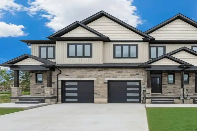 END UNIT Brand-new luxury freehold townhomes in Niagara Falls featuring 3 bedrooms, 2.5 bathrooms, hardwood flooring throughout, quartz countertops, custom cabinets, glass showers, and 10 Ft ceilings on the main floor, 9-ft ceilings on all floors. These two-storey homes offer open-concept layouts, built-in fireplaces, covered decks, and high-end finishes throughout. This end unit features separate side entrances with potential for a legal Accessory Dwelling Unit (ADU). Enjoy upgraded garage doors with WiFi capability, finished driveways, concrete porches, 30-year shingles, black-framed oversized windows, and oversized garages 11′ x 20′. Additional features include over 60 pot lights, a 200-AMP panel, upgraded trim and doors, a second-floor laundry, a bonus flex room, a smart home system, and keyless entry. Whether you’re a first-time buyer, a growing family, or looking to downsize without compromise, these homes offer the ideal combination of comfort, craftsmanship, and value. Discover contemporary living redefined. Located just 4 minutes from the QEW for easy commuting. Move-in ready! Please reach out to discuss other available units.
